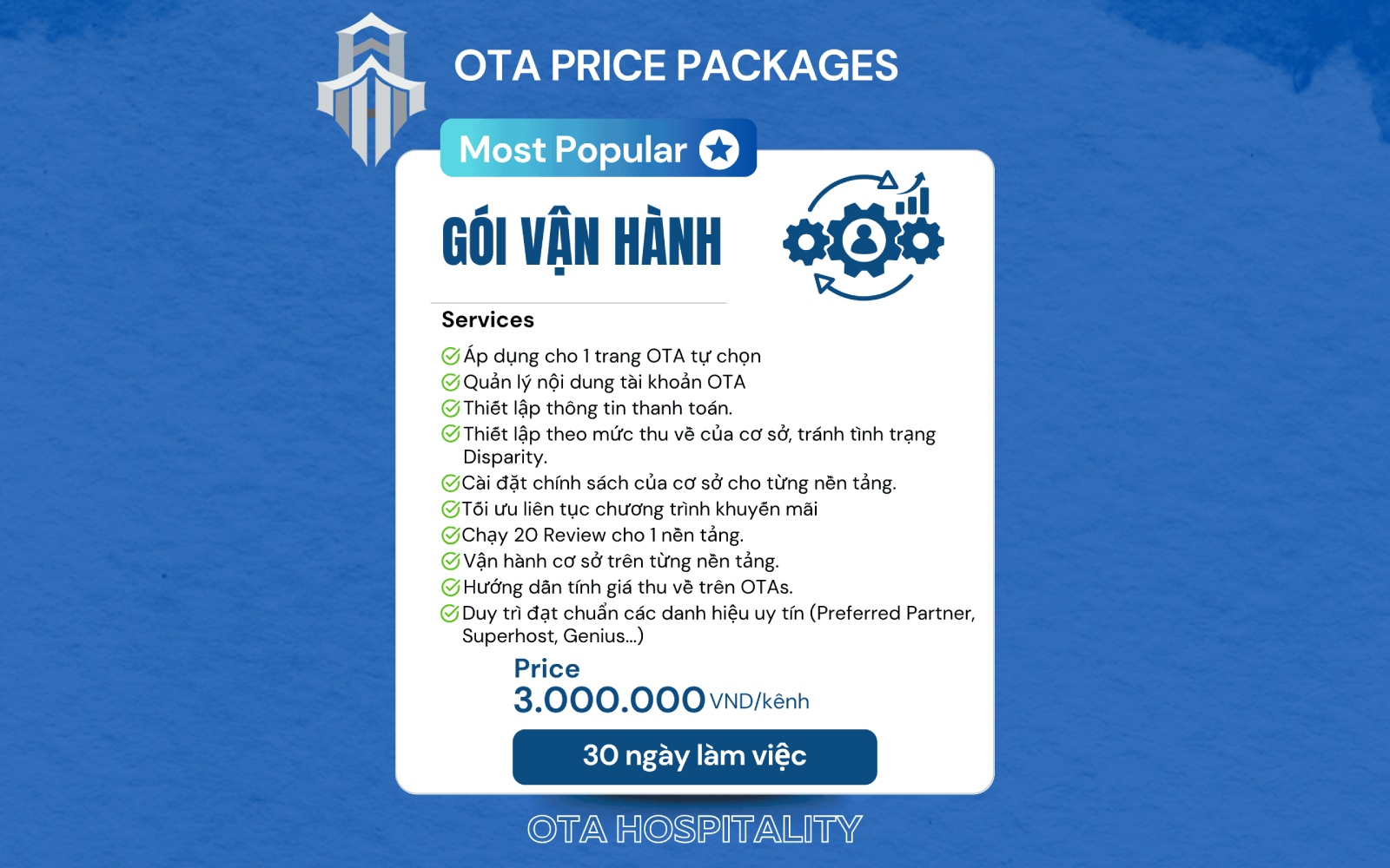 - Trong 30 ngày làm việc, chúng tôi triển khai 01 nền tảng theo lựa chọn của bạn: dựng hồ sơ chuyên nghiệp với hình ảnh bắt mắt, tiêu đề–mô tả thuyết phục, gắn thẻ USP/điểm nổi bật; cấu hình thanh toán an toàn và linh hoạt; xây khung giá thông minh theo mùa, weekday/weekend, lead time & LOS; thiết lập chính sách phù hợp từng OTA (hủy, nhận/trả, phụ phí); tối ưu khuyến mãi (mobile/member/early/last) để tăng hiển thị và tỷ lệ đặt; cài đặt tin nhắn mẫu & quy trình phản hồi nhanh; đồng thời thiết lập hệ thống xin đánh giá hợp lệ (QR/Email/SMS) nhằm đạt 10–20 review đầu tiên từ khách thật để củng cố uy tín.